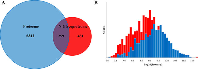 Figure 5: Global proteome versus the N-glycoproteome. (A) The overlap in the protein groups identified in both proteome and N-glycoproteome. (B) Intensity distribution of all glycosites only identified in the N-glyco experiment (red bars) overlaid with intensity distribution of N-glycosites whose corresponding proteins were also identified in the proteome data set (blue bars).