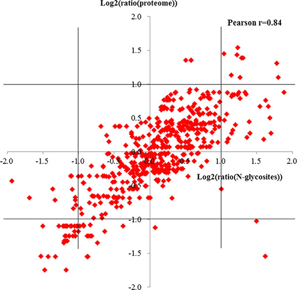 To evaluate the effect of protein normalization on measured glycosylation changes, we focused on the N-glycoproteins quantified in both proteome and N-glycoproteome, and compared the quantitative N-glycoproteomic ratios of 570 N-glycosites which mapped to 208 proteins, and the ratios in protein expression level after filtering with at least two valid ratio values (Supplementary Table 12). The ratios of the N-glycosites against protein ratios correlate well (Pearson r = 0.84), indicating that changes in N-glycosylation of a protein are usually a reflection of the change of protein abundance. However, protein ratios were located within a range of ±1 (log2 scale) and glycosylation site ratios were outside the –1 and +1 interval at the same time suggesting significant changes in the glycosylation occupancy of these proteins (Figure 6).