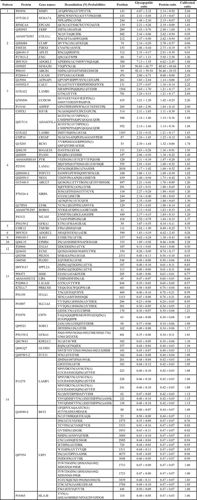 Table 1: Representative lists of N-glycosite-containing peptides whose changes before and after normalization by protein abundance