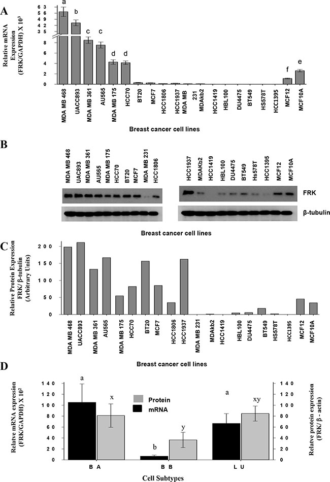 Figure 1: FRK levels are repressed in a subset of human breast cancer cells. (A) FRK transcript levels relative to that of GAPDH in each breast cancer cell line was assessed by qRT-PCR and then normalized to that of the HCC1395 breast cancer cells to determine the relative FRK transcript abundance. (B) FRK protein levels in each cell was analyzed from the cell lysates by immunoblotting using an FRK antibody (Santa Cruz), β-tubulin, a house keeping gene was used as a loading control. (C) Mean protein expression levels from (B) were quantified by densitometry and presented as the relative FRK/ β-tubulin expression using arbitrary units. (D) The mean relative expression of FRK (mRNA and protein) and β-actin levels in 37 breast cancer cell lines that were classified in the three cohorts Luminal (LU), Basal A (BA) and Basal B (BB) breast cancer cells. The mean relative protein expression levels were quantified by densitometry analysis of immunoblots in the Supplementary Figure 1A. The FRK expression was determined relative to β-ACTIN, a house keeping gene. Data is presented as Mean ± SEM, different superscripts a-z are used to indicate significant differences across means (a-z = P ≤ 0.05).