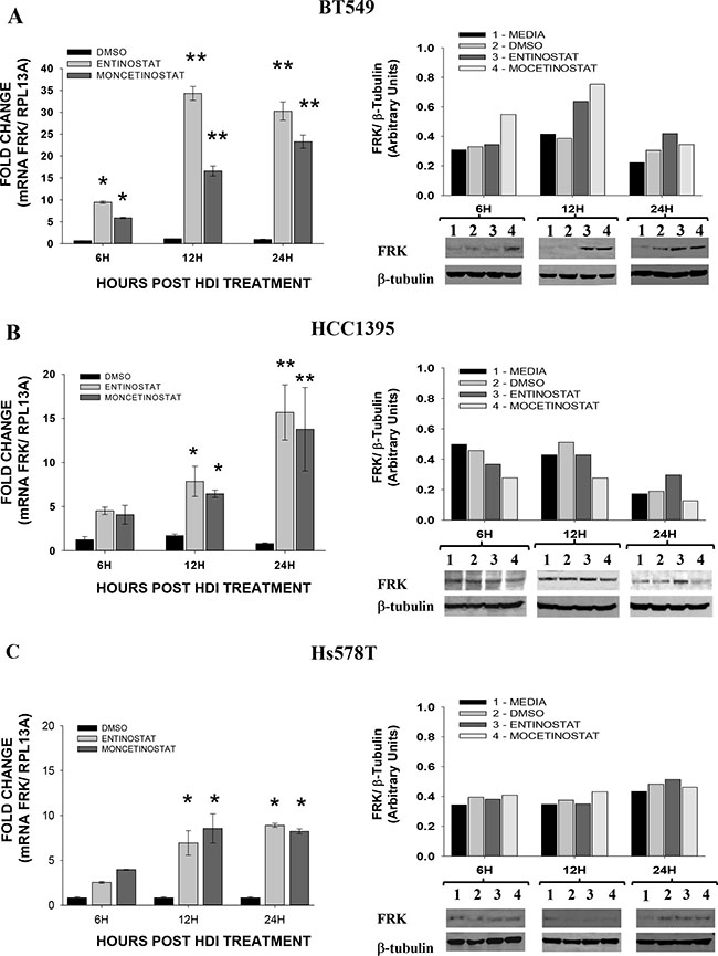 Figure 4: Histone deacetylase Inhibitors induces the expression of FRK in breast cancer cells. Breast cancer cellsBT549 (A), HCC1395 (B) and Hs578T (C) were treated with either Entinostat (MS275; 2 μM) or Mocetinostat (MGCD0103; 1 μM) dissolved in DMSO, for the time periods of 6, 12 and 24, hours, indicated on x-axis as 6H, 12H, and 24H respectively; while, controls at all the given time points received the vehicle (DMSO; 0.2 μl/ ml). To evaluate the relative FRK transcript abundance post-treatment, the FRK transcript levels in cells were determined relative to that of the house keeping gene, (Ribosomal Protein L13a) RPL13A using qRT-PCR. The fold change was then calculated relative to the controls in each experiment. Data is presented as Mean ± SEM, asterisks represent mean values greater than controls (*P ≤ 0.05 and **P ≤ 0.01). The FRK protein levels in each cell lysate was analyzed by immunoblotting using an FRK antibody, the mean relative protein expression levels were then quantified by densitometry analysis of immunoblots. The FRK expression was determined relative to β-TUBULIN, a house keeping gene and presented as arbitrary units.