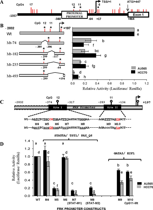 Figure 6: The promoter regions proximal to CpGs 11 and 12 are crucial for the transcription of FRK. (A) A schematic representation of the FRK promoter region from +447 to −1357 of the TSS/+1 showing the 17 CpG sites as vertical red lines along the promoter. (B) The CpG sites 11 and 12 are marked as vertical red lines within each of the constructs. The region deleted from each promoter construct is indicated along the breaks of each horizontal bar to the left of the y-axis for constructs mutant 74 (Mt-74), Mt-185, Mt 235 and Mt-493. (C) A schematic representation of the FRK promoter regions flanking the CpG 12 and 11, sites I (−374/−317) and II (−283/ −134). The wild type (upper case) and the mutated nucleotides (lower case) are shown below each of the targeted sites. The human FRK promoter mutant constructs (Mt; M4 to M8 and M9 to M10 carried site-specific mutations as indicated in sequences below the site boxes (C). AU565 and HCC70 breast cancer cells were transfected with 495 ng per well of various FRK promoter constructs of the human FRK promoter as indicated on the left of the y-axis (B) or below the x-axis (D). Results are shown as relative activity of each construct with respect to the full length FRK promoter construct −2832/+197bp (mean ± S.E.M.). A different letter indicates a statistically significant difference.