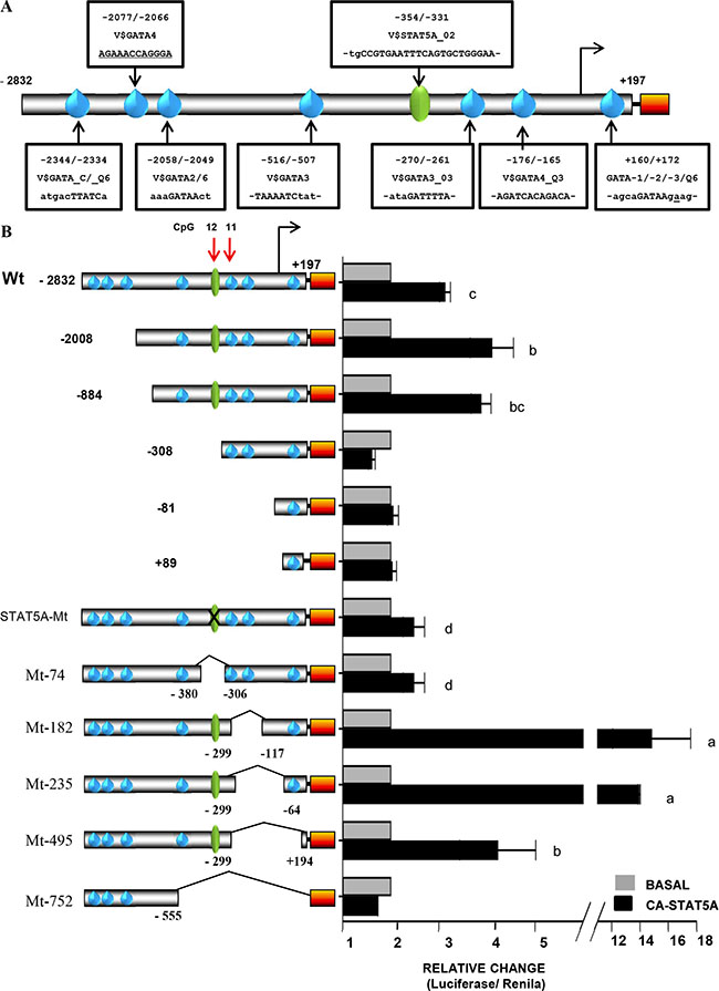 Figure 7: Constitutively active STAT5A up-regulates the FRK promoter activity. (A) A schematic representation of the FRK promoter region −2832/+197, that was cloned up stream of the luciferase reporter gene (Orange box). The sequences of the putative binding sites of STAT5A and the GATA proteins (1, 2, 3, 4 and 6) are indicated along the promoter in boxes. (B) AU565 breast cancer cells were co-transfected with various FRK promoter constructs (245 ng per well) as indicated on the left of the y-axis in the graph 8B) along with 250 ng per well of a construct that express the constitutively active STAT5A(CA-STAT5A). Total DNA per well was kept at 500 ng per well. AU565 controls cells in each case were transfected with the empty pCDNA3 vector (Invitrogen). Results are shown as fold activation over control (mean ± SEM). The superscripts a-d indicates relative mean values that are significantly different (P ≤ 0.05).