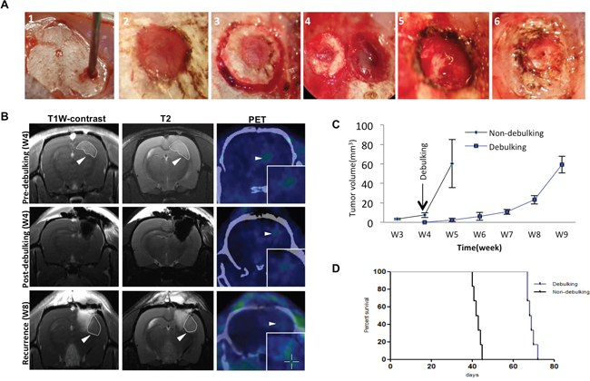 Figure 1: Survival in rats implanted with GBM is enhanced with surgical debulking. A. Representative images of implantation of spheroids with a wide bore syringe (1), burr hole drilled in the skull for implantation (2), craniectomy centered around the original burr hole in preparation for tumor debulking at week 4 (3), removal of skull bone (4), removal of tumor tissue by aspiration (5), and reinsertion of resected skull bone which was fixed with cyanoacrylate glue (6). B. Representative images of MRI and PET-CT scans of animals at one day before debulking (week 4), one day after debulking, and tumor recurrence (week 8). Circles (MRI) and arrows (PET) highlight areas of xenograft growth. C. Tumor volume (mm3) calculated from MRI scans plotted as a function of time in weeks. Tumor was resected at week 4 after implantation. D. Kaplan-Meier plots illustrating survival time (implantation = day 1) of nude rats (n = 6/group) with or without tumor debulking (P = 0.0005).