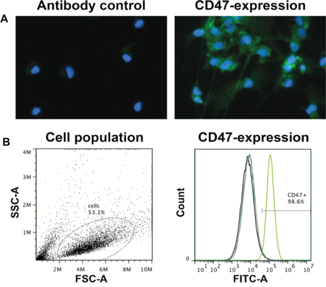 For ICC, single cells were seeded onto coverslips in a 24-well plate, allowed to attach overnight, rinsed twice with phosphate-buffered saline (PBS; Dulbecco’s phosphate-buffered saline; Sigma-Aldrich; St. Louis, MO, USA), fixed for 10 min in 4% paraformaldehyde (PFA, Thermo Scientific, Rockford, USA), and rinsed three times with PBS. Coverslips were blocked in 0.5 % bovine serum albumin blocking buffer for 15 min, incubated with primary anti-CD47 antibody (BioXCell; Beverly, MA, USA) for 45 min at 37°C, rinsed twice with PBS, incubated with FITC-conjugated secondary anti-mouse antibody (1:200; Southern Biotech; Birmingham, Alabama, USA) for 45 min at 37°C, rinsed twice in PBS, and mounted in Vectashield mounting medium (Vector Laboratories; Burlingame, California, USA) with DAPI. Coverslips were imaged with fluorescence microscopy (Nikon TE2000 microscope; Nikon; Tokyo, Japan). Cells stained with secondary antibody only were used as the control. For flow cytometry, single cell suspensions were immediately fixed in 4% PFA for 10 min followed by a wash with PBS, 15 min blocking in 0.5% BSA, and incubation with anti-CD47 or isotype control antibody for 20 min at room temperature. CD47 staining was acquired on an AccuriC6 instrument (Becton Dickinson; Erembodegem, Belguim), and analyzed in FlowJo (TreeStar Inc.; Ashland, Oregon, USA). Positive gates were set on the basis of the isotype control staining.