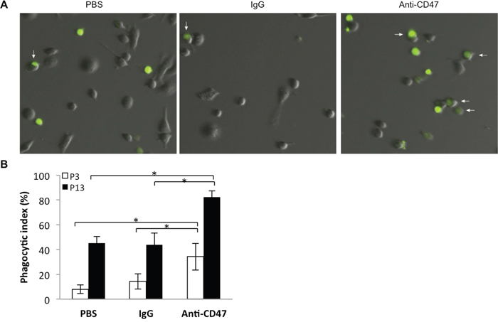 Figure 4: Nude rat bone marrow derived macrophages efficiently phagocytose P3 and P13 GBM tumor cells in an in vitro assay. A. Representative images of derived macrophages after incubation (2 h) with CFSE (green) labeled P3 and P13 tumor cells treated with anti-CD47 antibody or controls (PBS or IgG). Co-cultures were rinsed to remove free CFSE labeled P3 cells before imaging. B. Bar chart displaying the phagocytic index (number of phagocytosed tumor cells per 100 macrophages) with anti-CD47 antibody and controls (IgG and PBS) for two different GBM derived CD47+ xenografts, P3 and P13. Error bars represent SD.