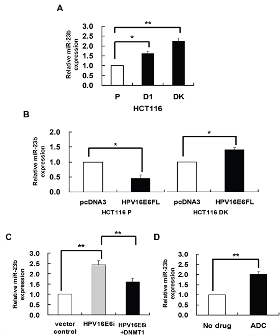 Figure 1: DNMT1 mediated the HPV-16 E6 suppression of miR-23. miR-23b expression level was determined by quantitative RT-PCR analysis. A. the miR-23b expression level in HCT116 parental, D1 and DK cells. B. HCT116 parental or DK cells were transiently transfected with pcDNA3/HPV16E6cDNA (HPV16E6FL) or pcDNA3 empty vector for 24 h. C. SiHa cells were transiently transfected with pSilencer/HPVE6siRNA (HPV16E6i) alone or co-transfected with pGFP-C3/DNMT1cDNA (HPV16E6i+DNMT1) for 24 h. The cells were transfected with pSilencer empty vector in parallel in which miR-23b expression level was designated as 1.0. D. SiHa cells were treated with 5 μM 5-aza-2’-deoxycytidine (ADC) for 24 h. Results were average from at least three separate experiments. Mean ± SD. *p<0.05, **p<0.01.