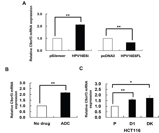 Figure 2: HPV-16 E6 silencing and DNA demethylation increased the expression of C9orf3 mRNA. C9orf3 mRNA expression level was determined by quantitative RT-PCR analysis. A. SiHa cells were transiently transfected with pSilencer/HPV16E6siRNA (HPV16E6i) or pcDNA3/HPV16E6cDNA (HPV16E6FL) for 24 h. The cells were transfected with pSilencer or pcDNA3 empty vector in parallel. B. SiHa cells were treated with 5 μM 5-aza-2’-deoxycytidine (ADC) for 24 h. C. C9orf3 mRNA expression level in HCT116 parental, D1 and DK cells. Results were average from at least three separate experiments. Mean ± SD. *p<0.05, **p<0.01.
