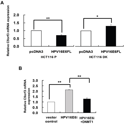 Figure 3: DNMT1 mediated the HPV-16 E6 suppression of C9orf3 mRNA expression. C9orf3 mRNA expression level was determined by quantitative RT-PCR analysis. A. HCT116 parental or DK cells were transiently transfected with pcDNA3/HPV16E6cDNA (HPV16E6FL) or pcDNA3 empty vector for 24 h. B. SiHa cells were transiently transfected with pSilencer/HPVE6siRNA (HPV16E6i) alone or co-transfected with pGFP-C3/DNMT1cDNA (HPV16E6i+DNMT1) for 24 h. The cells were transfected with pSilencer empty vector in parallel in which C9orf3 mRNA expression level was designated as 1.0. Results were average from at least three separate experiments. Mean ± SD. *p<0.05, **p<0.01.