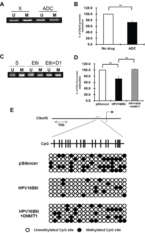 Figure 4: The methylation status of the C9orf3 promoter region in SiHa cells. A and B. the cells were either untreated (X) or treated with 5 μM 5-aza-2’-deoxycytidine (ADC) for 24 h. A, the PCR products amplified by unmethylation-specific primers (U) and methylation-specific primers (M) were revolved in 2% agarose gel. A representative experiment was shown while similar results were obtained from at least three separate experiments. B, the percentage of C9orf3 promoter methylation was shown. Mean ± SD. **p<0.01. C and D. the cells were transiently transfected with pSilencer/HPV16E6siRNA (E6i) alone or co-transfected with pGFP-C3/DNMT1cDNA (E6i+D1) for 24 h. The cells were transfected with pSilencer empty vector (S) in parallel. (C) the PCR products amplified by unmethylation-specific primers (U) and methylation-specific primers (M) were revolved in 2% agarose gel. A representative experiment was shown while similar results were obtained from at least three separate experiments. (D) the percentage of C9orf3 promoter methylation was shown. Mean ± SD. **p<0.01. E. genomic bisulfite sequencing of C9orf3 promoter region was performed. The cells were transiently transfected with pSilencer/HPV16E6siRNA (HPV16E6i) alone or co-transfected with pGFP-C3/DNMT1cDNA (HPV16E6i+DNMT1) for 24 h. The cells were transfected with pSilencer empty vector in parallel. The position of the CpG island in C9orf3 promoter region was indicated. Open and closed circles represent unmethylated and methylated CpG sites, respectively.