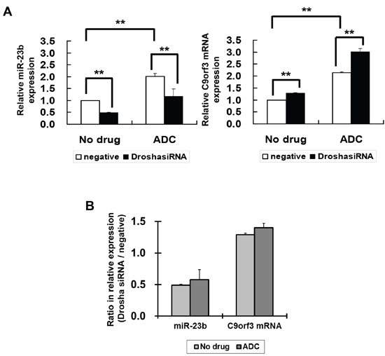 Figure 5: The effect of Drosha and 5-aza-2’-deoxycytidine on miR-23b and C9orf3 mRNA expressions in SiHa cells. A. The cells were transiently transfected with Drosha siRNA or negative siRNA for 24 h followed by 24-hour treatment of 5-aza-2’-deoxycytidine (ADC). miR-23b and C9orf3 mRNA expression levels were then determined by quantitative RT-PCR analysis. Results were average from at least three separate experiments. Mean ± SD. **p<0.01. B. the ratio (Drosha siRNA / negative) for the relative expression of miR-23b or C9orf3 mRNA in cells with or without the ADC treatment.