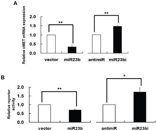 Figure 6: c-MET as a gene target of miR-23b. A. SiHa cells were transiently transfected with miR-23b precursor vector (miR23b) or anti-miR-23b inhibitor (miR23bi), respectively, for 24 h. The cells were transfected with empty vector or anti-miR-negative control in parallel. c-MET mRNA expression level was determined by quantitative RT-PCR analysis. B. SiHa cells were transiently transfected with pMIR-REPORT/cMET3’UTR together with miR-23b precursor vector (miR23b) or anti-miR-23b inhibitor (miR23bi) for 24 h followed by dual-luciferase reporter assay. The cells were co-transfected with empty vector or anti-miR-negative control in parallel. Results were average from at least three separate experiments. Mean ± SD. *p<0.05, **p<0.01.