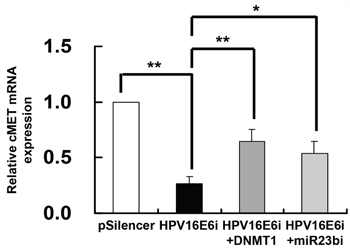 Figure 7: DNMT1 and miR-23b mediated the effect of HPV-16 E6 knockdown on c-MET mRNA expression in SiHa cells. The cells were transiently transfected with pSilencer/HPV16E6siRNA (HPV16E6i) alone or co-transfected with either pGFP-C3/DNMT1cDNA (HPV16E6i+DNMT1) or anti-miR-23b inhibitor (HPV16E6i+miR23bi) for 24 h. The cells were transfected with pSilencer empty vector in parallel. c-MET mRNA expression level was determined by quantitative RT-PCR analysis. Results were average from at least three separate experiments. Mean ± SD. *p<0.05, **p<0.01.