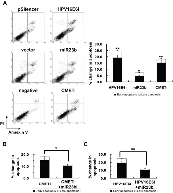 Figure 8: The effect of HPV-16 E6, miR-23b and c-MET on apoptotic cell death of SiHa cells. A. the cells were transiently transfected with pSilencer/HPV16E6siRNA (HPV16E6i), miR-23b precursor vector (miR23b) or c-MET siRNA (CMETi). The cells were transfected with empty pSilencer vector (pSilencer), empty vector (vector) or negative siRNA (negative), respectively, in parallel. Annexin V binding assay was performed 48 h after transfection to determine apoptotic cell death. A representative experiment was shown while similar results were obtained from at least three separate experiments. The percentage changes in early and late apoptosis were calculated by subtracting the percentage of apoptotic cells in the group transfected with empty pSilencer vector, empty vector or negative siRNA from that in the corresponding group transfected with pSilencer/HPV16E6siRNA, miR23b precursor vector or c-MET siRNA, respectively, and were shown as the bar chart in the right panel. B. the cells were transiently transfected with anti-miR-23b inhibitor together with c-MET siRNA (miR23bi+CMETi) or C. pSilencer/HPV16E6siRNA together with anti-miR-23b inhibitor (HPV16E6i+miR23bi) for 48 h followed by the annexin V binding assay to determine apoptotic cell death. The percentages of early and late apoptotic cells were shown in the bar chart. Results were average from at least three separate experiments. Mean ± SD. *p<0.05, **p<0.01.