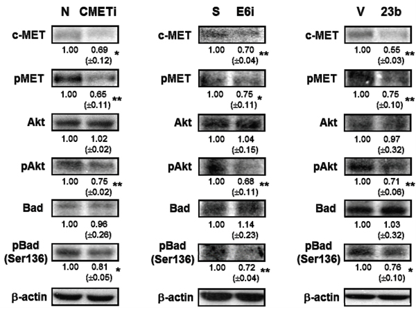 Western blot analysis was performed as previously described [27]. Primary antibodies against MET (L41G3), phosphor-MET (Tyr1234/1235), Akt (pan) (11E7), phosphor-Akt (Ser473), phosphor-Bad (Ser136) (Cell singling, MA, USA), Bad (C-20) (Santa Cruz Biotechnology, CA, USA) and β-actin (Sigma, MO, USA) were used.