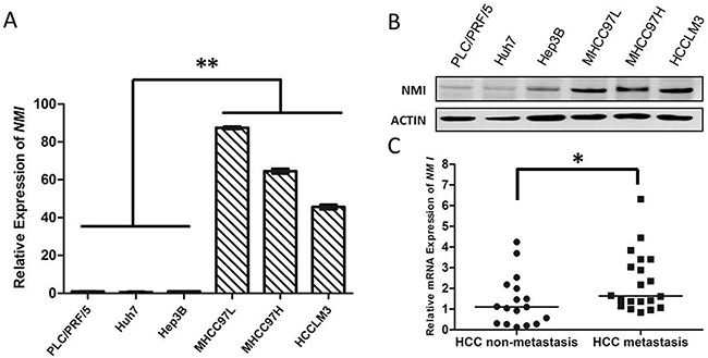 Figure 1: NMI expression is positively associated with HCC metastasis. A, B. NMI mRNA expression and protein expression were detected in metastatic (MHCC-97L, MHCC-97H and HCC-LM3) and non-metastatic (PLC/PRF/5, Huh7 and Hep3B) HCC cell lines. C. In 37 HCC tumors specimens, the NMI expression of metastatic group (n = 20) was higher (*P < 0.05) than those of non-metastatic group (n = 17).