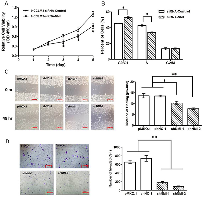 Figure 2: Knock down of NMI inhibited in vitro cell processes. A. Cell growth rates in HCC-LM3 cells transfected with NMI siRNA were much less than that of those controls (*P < 0.05). B. Cell cycle G1/S arrest in HCC-LM3 cells transfected with NMI siRNA compared with controls (*P < 0.05). C. The distances of wound healing in NMI knock-down HCC-LM3 cells were shorter than of those controls in 48 hours (*P < 0.05). D. The in vitro invaded cell numbers were analyzed in HCC-LM3 cells transfected with shNMI or scrambled shRNA or empty vector (**P < 0.01).