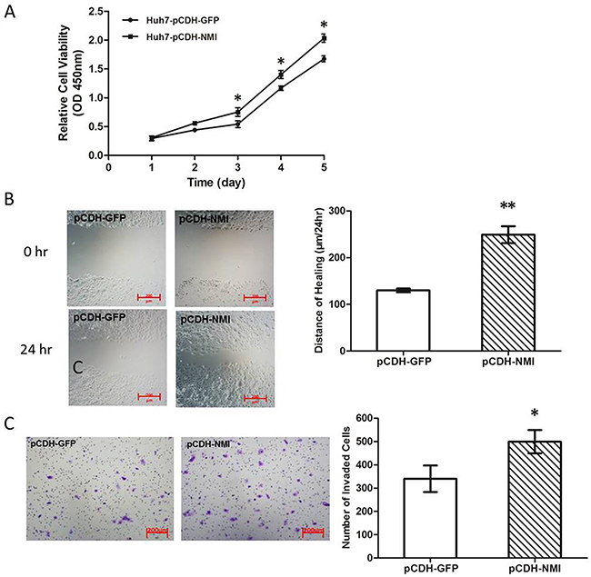 Figure 3: NMI overexpression promoted HCC cell progresses in vitro. A. Cell growth rates in Huh7 cells with up-regulation of NMI were much larger than that of those controls (*P < 0.05). B. The distance of wound healing in Huh7 cells with up-regulation of NMI was longer than of those controls in 48 hours (**P < 0.01). C. The in vitro invaded cell numbers were analyzed in Huh7 cells transfected with shNMI or scrambled shRNA (*P < 0.05).
