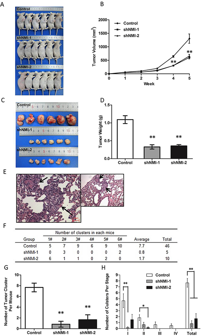 Figure 4: The effects of NMI on in vivo tumor growth and metastasis of HCC in a xenograft nude mice model. A-D. Knockdown of NMI reduced the tumorigenicity. A, C. The tumor volumes derived from HCC-LM3 cell line stably transfected with shNMI or scrambled shRNA was measured in vivo for 5 weeks. (B) Both in vivo tumor growth rates and tumor size in mice models subcutaneously implanted with NMI knock-down HCC-LM3 cells were much slower than that of the controls after 3 weeks (**P < 0.01). (D) Weights of the xenograft tumors in models implanted with HCC-LM3 cells transfected with shNMI were much less than that of the controls (**P < 0.01). E-H. NMI silence decreased tumor metastasis in vivo. Effect of NMI on spontaneous metastasis was assayed via orthotopic implantation. (E) H&E staining of metastatic nodules formed at lung after NMI knockdown tumor tissue implantation into the liver with magnification of the selected areas. (Arrows: metastatic HCC nodules in the lung tissues). (F) All mice in control group had lung metastasis (100%, 6/6). The mice of the two lower NMI expression groups had less metastasis (33.3%, 2/6 and 66.7%, 4/6). (G) The number of tumor cluster of each experiment group mouse was significantly lower than control (**P < 0.01). (H) Staging of lung metastasis in HCC, the experimental group metastatic phases according to the cell number of metastatic lesion were significantly earlier than control group (*P < 0.05, **P < 0.01).