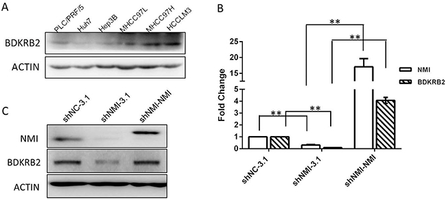 Figure 5: BDKRB2 may be the downstream target of NMI. A. BDKRB2 protein expression were detected in metastatic (MHCC-97L, MHCC-97H and HCC-LM3) and non-metastatic (PLC/PRF/5, Huh7 and Hep3B) HCC cell lines. B, C. qRT-PCR and Western blotting showed the expression of BDKRB2 was significantly lower in NMI-knockdown HCC-LM3 cells than that of controls, and recovered the levels in the NMI-knockdown cells with re-transfected pcDNA3.1-NMI plasmid. NMI and BDKRB2 are positively correlated in HCC-LM3 cells.
