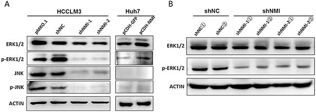 Figure 6: NMI induced MAPK/ERK signaling pathway. A. Western blotting showed the ERK1/2 and phospho-ERK1/2 expressions in HCC-LM3 cells transfected with shNMI or Huh7 cells with up-regulation of NMI and their corresponding controls respectively. B. The expressions of phosphorylated EKR1/2 were decreased in subcutaneous tumors of mice models implanted with NMI knockdown HCC-LM3 cells compared with those of controls.