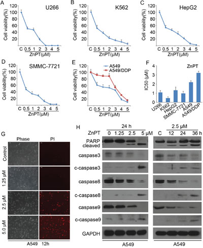 Figure 1: Induction of apoptosis in cancer cells by ZnPT. A-E. Cytotoxic curves in multiple cancer cells. U266 (A), K562 (B), HepG2 (C), SMMC-7721 (D), A549 (E) and A549/DDP (E) cells were treated with escalating doses of ZnPT for 48 hours, cell viability was detected by MTS assay. n=3, Mean±SD. F. Viable cells by 50% compared with vehicle control (IC50) in a panel of cancer cell lines treated with ZnPT for 48 hours. G. ZnPT induces cell death in A549 cells. A549 cells were treated with the indicated doses of ZnPT, then PI was added to the cultured cells after 12 hours treatment, PI-positive staining was monitored under an inverted microscopy and typical images were shown. H. ZnPT induces cleavage of PARP, caspase-3, -8, -9 in A549 cells. A549 cells were treated with ZnPT at various doses or for various times, PARP, and caspase-3, -8, -9 cleavage were analyzed by immunoblotting. GAPDH was detected as a loading control.
