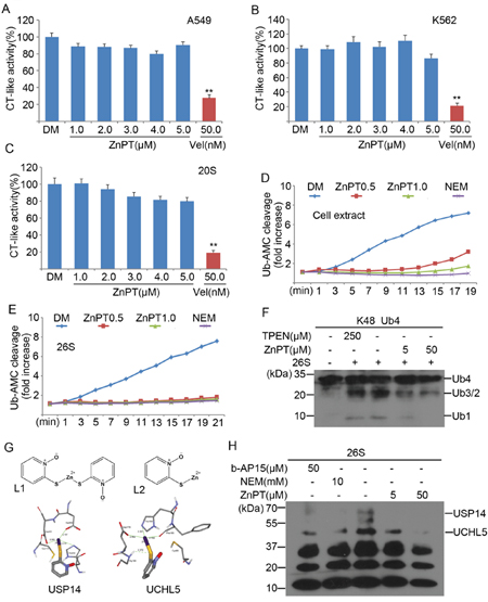 Figure 3: ZnPT inhibits the UPS by targeting 26S-associated DUBs USP14 and UCHL5. A-C. The in situ and in vitro effects of ZnPT on proteasome peptidase activity. Lysates from ZnPT or Vel-treated A549 (A) and K562 (B) cells were analyzed for proteasome chymotrypin-like activity. Purified 20S proteasomes (C) were treated with indicated doses of ZnPT, chymotrypin-like activity was measured using specific synthetic fluorogenic substrates. Vel was used as a positive control. Values are expressed as mean ± SD (n = 3). **P < 0.01, compared with each control. D, E. The effect of ZnPT on DUB activities. A549 celllysates (D) and purified 26S proteasomes (E) were exposed to ZnPT (0.5, 1.0 μM) and dynamic DUB activity was measured. NEM was used as a positive control. F. Inhibition of ubiquitin chain disassembly by ZnPT. Purified 26S proteasomes were treated with ZnPT (5.0, 50μM), TPEN (250 μM), or b-AP15 (50 μM), followed by the detection of disassembly of K48-linked ubiquitin tetramers using western blots. G. Computational molecular docking of ZnPT with UCHL5 and USP14. The following data were shown: the structure of zinc pyrithione (L1); the structure of zinc pyrithione intermediate (L2); the binding modes of compound L2 at the active site of USP14and UCHL5. H. Abolishment of Ub-VS labeling of proteasomal DUBs by ZnPT. Purified 26S proteasomes were treated with ZnPT (5.0, 50μM), NEM (10 mM), or b-AP15 (50 μM), followed by labeling with HA-UbVS and immunoblottingusing an anti-HA antibody.
