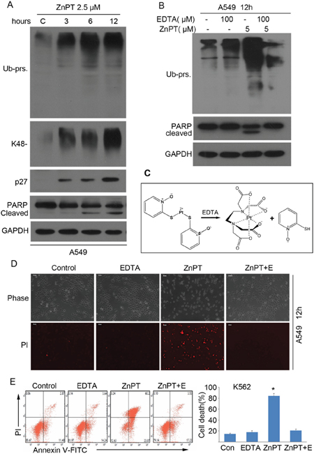Figure 5: Proteasome inhibition is required for ZnPT to induce apoptosis. A. ZnPTinduces proteasome function inhibition and apoptosis at different time course. A549 cells were treated with ZnPT (2.5 μM), then the cells were collected at the indicated time points for western blot analysis for ubiquitinated proteins including total Ub-prs and K48-linked Ub-prs, p27 and PARP cleavage. B. EDTA effectively prevents ZnPT-induced proteasome inhibition and apoptosis. A549 cells were treated with ZnPT in the presence/absence of chelating agent EDTA (100 μM) for 12 hours, total Ub-prs and PARP cleavage were detected by Western blot. C. An illustration of the coordination of Zn2+ with ethylenediaminetetraacetic acid (EDTA) from ZnPT. D, E. EDTA completely reversed ZnPT-induced cell death. A549 cells were treated with ZnPT, alone or in combination with chelating agent EDTA (100 μM) for 12 hours, followed by imaging under fluorescence microscopy (D) or flow cytometry (E) for recording death cells. Values are expressed as mean ± SD (n = 3). *P < 0.05, compared with each control.