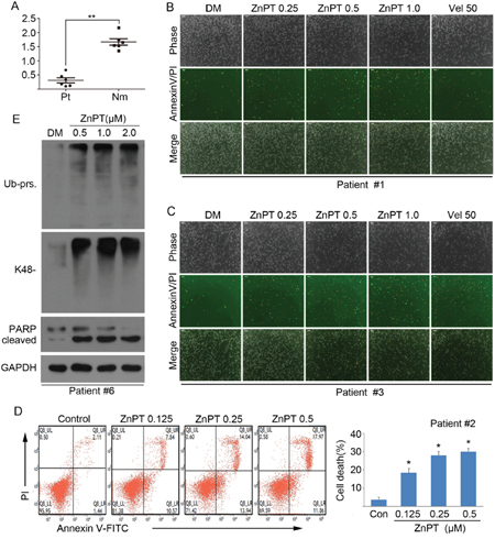 Figure 6: Effect of ZnPT on primary monocytes from leukemia patients. A. Bone marrow cells from 6 leukemia patients (Pt) and peripheral blood mononuclear cells from 6 healthy volunteers (Nm) were treated with ZnPT at the indicated doses for 48 hours, then the cell viability was detected by MTS assay. The scatter plots of the IC50 values of ZnPT in each group were shown. Values are expressed as mean ± SD (n = 3). **P < 0.01, compared with Pt group. B-D. Cancer cells from leukemia patients were treated with increasing doses of ZnPT for 24 hours, cell apoptosis from two samples (#1 and #3) were recorded with AnnexinV/PI double staining under a fluorescent microscopy (B, C) or one sample (#2) was analyzed by flow cytometry (D). Values are expressed as mean ± SD (n = 3). *P < 0.05, compared with each control. E. Leukemia cells were incubated with ZnPT at the indicated doses for 24 hours, ubiquitinated proteins and PARP were detected by western blot. Representative images from one sample (#6) were shown.