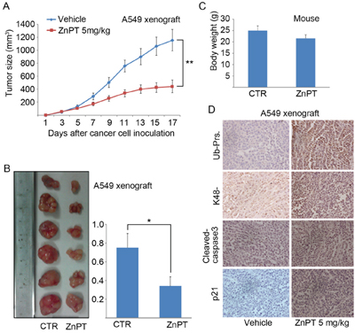 To further confirm the preclinical antineoplastic action of ZnPT, immunodeficient BALB/c nude mice were injected subcutaneously with A549 cells, followed by treatment with intraperitoneal injections of ZnPT. At doses that did not cause any significant body weight reduction, ZnPT strongly reduced the growth of A549-derived xenografts as shown in the tumor size curves and images (Figure 7A and 7B). ZnPT-treated mice also showed a significant reduction in tumor weight (Figure 7B), consistent with the tumor size data. Importantly, the body weight was relatively stable in ZnPT-treated group (Figure 7C). These results indicate that ZnPT could selectively inhibit in vivo tumor growth without apparent toxicity to host animals. We previously found that one of the effects of ZnPT treatment in vitro is the proteasome inhibition (Figure 2A and 2B). Consistent with these data, highly increased levels of typical proteasome substrates including total and K48-linked ubiquitinated proteins and p21, accompanied by caspase-3 activation, were observed in ZnPT-treated tumor xenografts with immunohistochemistry staining analysis (Figure 7D), suggesting that proteasome is a molecular target of ZnPT in vivo.