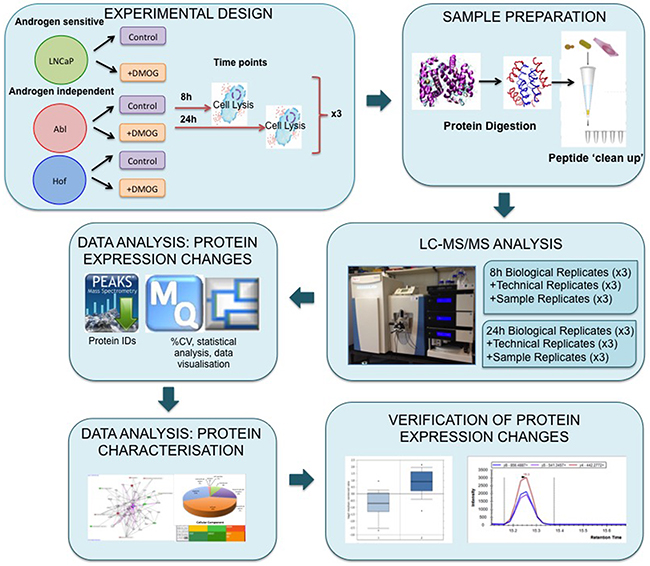 This work described here was undertaken to continue a previous study that was aimed at investigating the impact of glucose deprivation in aggressive PCa (manuscript in press). The primary objective of this study was to utilize mass spectrometry to comprehensively compare the proteome of androgen-independent and androgen-sensitive cell lines under both hypoxic and normoxic conditions. Hypoxic conditions were achieved by treatment of the LNCaP, LNCaP-abl and LNCaP-abl Hof cell lines with dimethyloxalylglycine (DMOG). Rigorous workflows were implemented for identification and verification of protein expression changes attributable to the hypoxic status and/or androgen sensitivity of the cell lines. Each stage of the investigative process was carefully planned to ensure that (i) observed changes in protein expression were not influenced by any experimental or technical bias (ii) potential biological and/or clinical significance was established for any identified proteins of interest and (iii) verification of selected protein of interest could be performed in a robust, reproducible and high throughput manner.