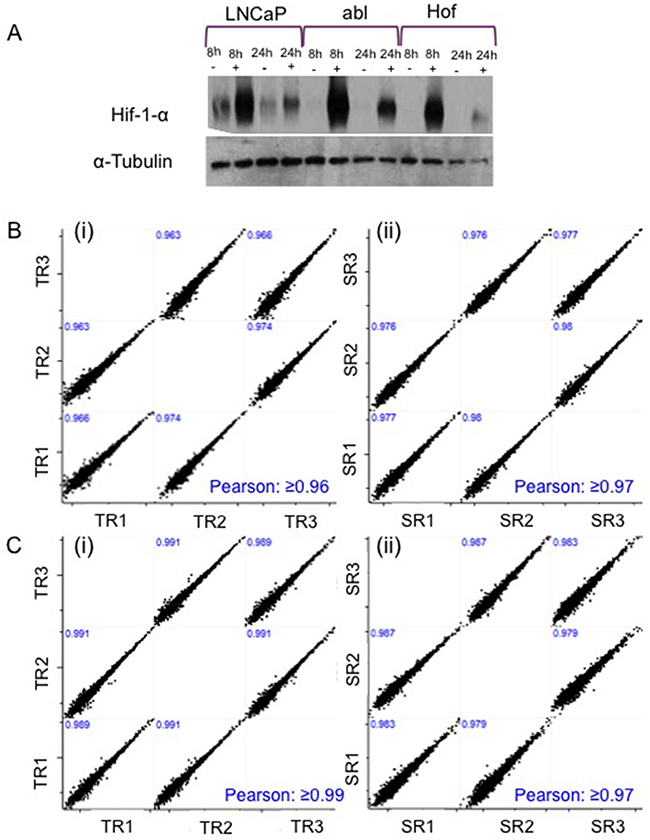 Figure 2: Confirmation of Hypoxic Conditions and Technical Reproducibility. Hypoxic conditions following treatment with DMOG were confirmed with expression of Hif-1 alpha in all cell lines after 8 h and 24 h incubation A. Sample and Technical reproducibility of the LC-MS/MS analysis was confirmed with scatter plots showing Pearson Correlation values ≥0.9 at both 8 hours B. and 24 hours C.