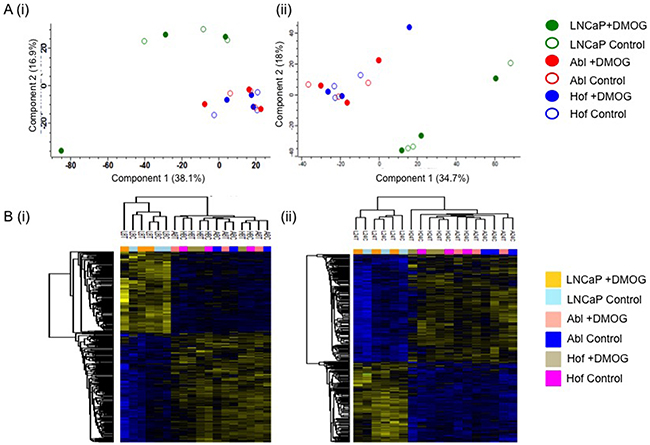 Figure 5: Proteomic Characterisation of Androgen Sensitive and Androgen Independent PCa cell lines. The androgen sensitive (LNCaP) and androgen independent (Abl and Hof) cell lines show clear differences in protein epression, irrespective of hypoxic conditions. Principal Component Analysis revealed clear separation between Androgen Sensitive and Androgen Independent PCa cell lines at both 8 hour A(i). and 24 hour A(ii). time points. ANOVA (p≤0.05) revealed 321 and 531 significantly changing proteins at 8 hours B(i). and 24 hours B(ii). respectively.