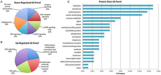Figure 6: Biological Interrogation of Androgen Sensitivity (AS)-Associated Proteins of Interest. Panther analysis was performed on proteins selected based on their association with androgen sensitivity in this study. Pathways associated with cancer progression were represented by both up and down-regulated protiens of interest A-B. The majority of proteins were classified as hydrolases, transferases and oxidoreduuctase C.