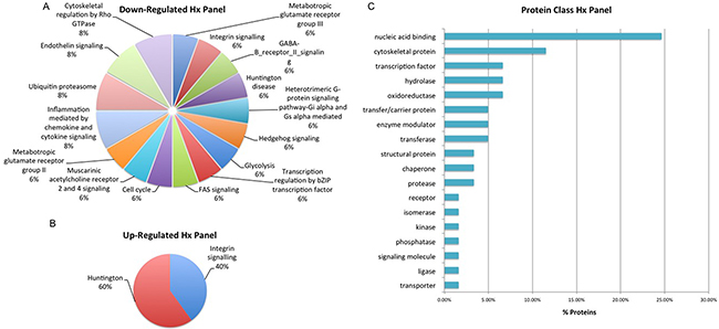 Figure 7: Biological Interrogation of Hypoxia (Hx)-Associated Proteins of Interest. Panther analysis was performed on proteins selected based on their association with hypoxia in this study. The majority of down-regulated proteins map to a large number of signaling pathways A. while up-regulated protiens were associated to the Integrin Signalling and Huntington pathways B. The majority of proteins were classified as nucleic acid binding proteins C.