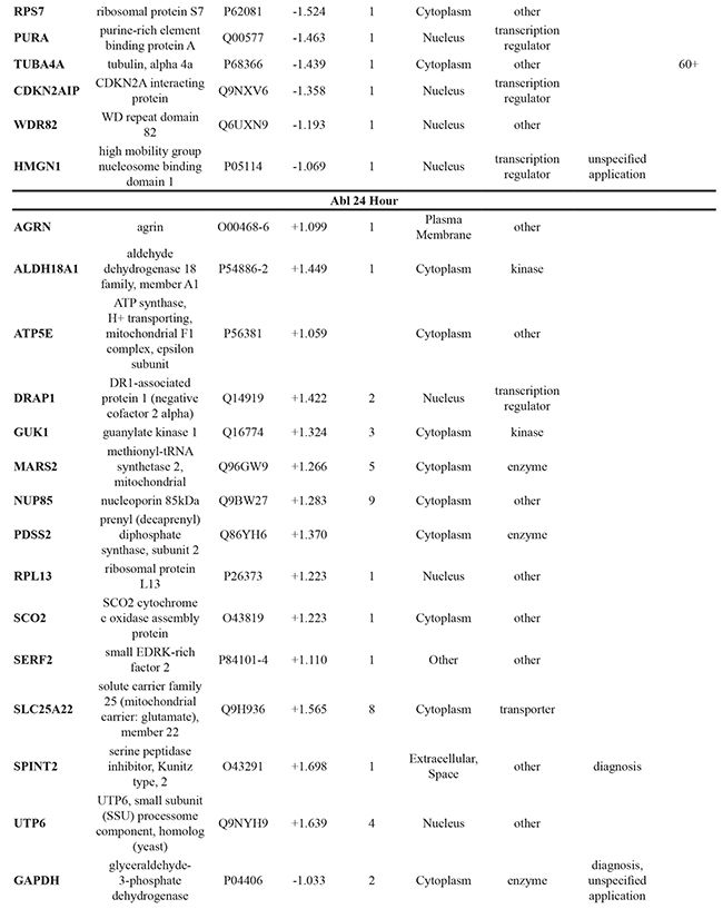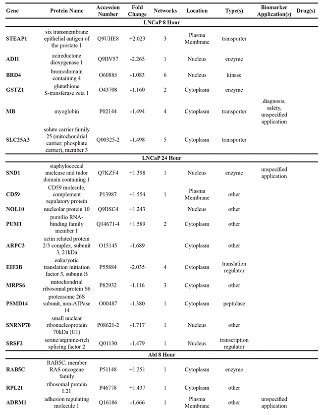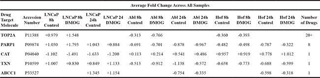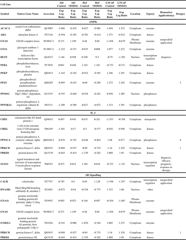 All proteins identified as significantly changing through ANOVA (p≤0.05) analysis of all samples at both time points were uploaded onto IPA for analysis. The most significant changes between the three cell lines (treated and control) were observed after 24 hours. Comparative analysis of the cell lines at this time point indicated that the AMPK, IL-3 and Androgen Signaling pathways were the most differentially regulated between androgen sensitive (LNCaP) and androgen independent (Abl and Hof) cell lines. The proteins associated with these pathways, which contribute most significantly to the deregulation between androgen sensitive and androgen independent cell lines, are indicated in Table 2. As indicated in this table, a number of these proteins have previously been reported as a cancer biomarker and a number of these molecules are also targetable by various therapeutic agents (Table 2). Aside from those molecules associated with the AMPK, IL-3 and AR-Signaling pathways, there were a number of other molecules identified from both the IPA and Perseus analysis that show a deregulation between androgen sensitive and androgen independent cell lines. A number of these can also be targeted by a number of therapeutic agents and/or combinations of therapeutic agents (Table 3). Almost all of these therapeutic agents are currently FDA approved or under investigation for use in cancer therapy. Notably, of the 12 currently FDA approved therapeutic drugs for PCa, mitoxantrone and docetaxel were found to be therapeutic targets for one of the significantly changed proteins identified in this study – TOP2A (Table 3). In these data TOP2A, which has previously been associated with PCa progression, is significantly up regulated in the androgen sensitive (LNCaP) cell line and down regulated in the androgen independent (Abl and Hof) cell lines at 8 hours. This up or down-regulation was found to be maintained, and even marginally accentuated, after treatment with DMOG (Table 3).