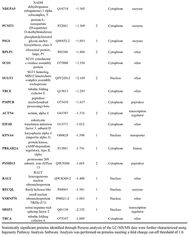 To further elucidate the changes caused by the DMOG-induced hypoxic microenvironment, proteins identified as statistically significant within each cell line following 8 hour and 24 hour treatment with DMOG (Student’s t-test analysis) were analysed using Ingenuity Pathway Analysis (IPA) software. For all cell lines, at both time points, it was possible to identify molecules associated with both cancer metastasis and HIF signaling in the respective network maps generated from the IPA analysis. This analysis also highlighted a number of deregulated molecules that have previously been reported as a cancer biomarker (Table 1).