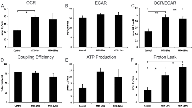 Figure 6: Cellular bioenergetics of human hepatocellular HepG2 cells treated with methotrexate 10 μM. Addition of MTX was timed to be 6 or 12hrs prior to the assays performed at the end of a 24hr total culture period. A. Steady and increased levels of OXPHOS (basal respiration used to meet a cell’s ATP demands) in MTX treated cells, B. steady glycolysis (ECAR) rate after MTX treatment, C. steady-state OCR/ECAR coefficient ratio continuing during MTX treatment, D. consistent coupling efficiency (percentage of basal respiration used to drive ATP synthesis divided by proton leak) in OXPHOS metabolism following MTX treatment, E. increased ATP generation (calculated from: OCR basal respiration minus proton leak) in MTX treated cells, F. increasing proton leakage (non-ATP linked OCR) across mitochondria inner membrane in MTX treated cells are shown. Each treatment group shows mean of 6 wells ± SD, data representative of 2 biological replicates. *p<0.03, **p<0.05, OCR - oxygen consumption rate, ECAR - extracellular acidification rate, OXPHOS - oxidation phosphorylation, ATP - adenosine triphosphate.