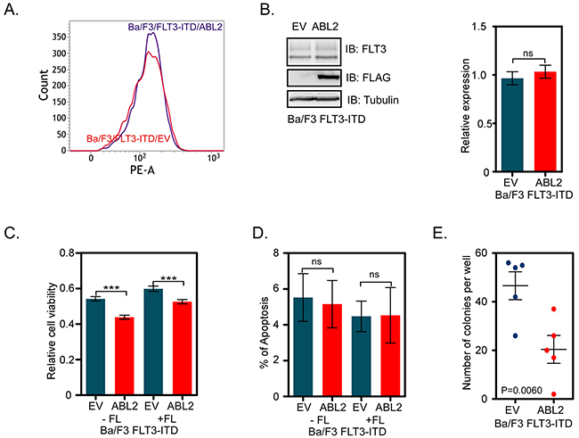 Figure 2: ABL2 expression reduces FLT3-ITD-mediated cell viability and colony formation: A. Ba/F3-FLT3-ITD cells expressing ABL2, or empty vector were labeled with phycoerythrin-conjugated anti-FLT3 antibody. Samples were then analyzed by flow cytometry. B. Ba/F3-FLT3-ITD cells expressing ABL2, or empty vector were lysed. Equal amount of proteins from total cell lysates were subjected to Western blot analysis. Blots from multiple experiments were quantified and analyzed using student’s t-test. C. Ba/F3 cells expressing FLT3-ITD and ABL2 or FLT3-ITD and empty vector were used for the PrestoBlue cell viability assay. D. Cells positive for Annexin V and 7-aminoactinomycin D (7-AAD) or only for Annexin V were counted as apoptotic cells. E. Cells were washed to remove IL-3 and serum. Cells were mixed with 80% methylcellulose medium and seeded in a 24-well plate. ns, not significant; ***, p<0.001.