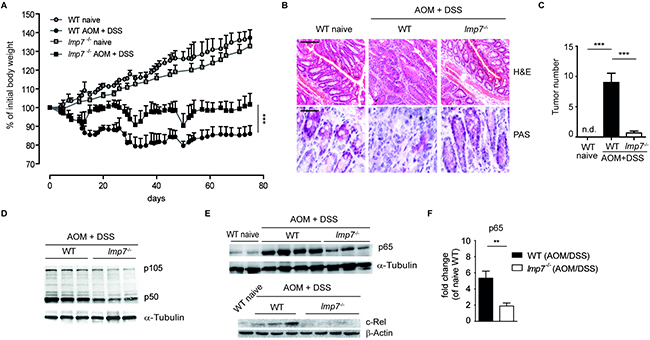 Figure 2: Immunoproteasome subunit LMP7 is essential for development of colitis-associated cancer (CAC). A. CAC was induced in WT and lmp7−/− mice and the change in weight was monitored in naïve and AOM/DSS-treated mice over a period of 75 days. Data represent mean ± SEM (n=10-12 mice per group). ***P<0.001. B. Representative images of H&E- and PAS-stained colon sections of control or AOM/DSS-treated mice (day 80). Scale bars: 100µm for H&E and 200µm for PAS staining. C. Colonic tumor incidence in naïve and AOM/DSS treated mice (day 80). Data represent mean ± SEM (n=10-12 mice per group). ***P<0.001. D and E. Reduced NF-κB levels in LMP7 deficient mice after induction of CAC. Immunoblot analysis for p105/p50 (D), p65 and c-Rel (E) was performed for the whole colonic tissue of AOM/DSS-treated mice (day 80). α-Tubulin or β-Actin served as a loading control. A representative of two experiments is shown. F. Densitometric analysis for colonic p65 expression on day 80 after induction of CAC in WT and lmp7−/− mice. Data represent mean ± SEM of two independent experiments and are normalized to p65 expression in the colon of naïve WT mice. **P<0.01.