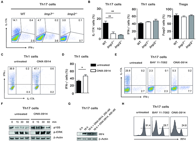Previously, it has been published that the blockade of LMP7 activity by its selective inhibitor ONX-0914 reduced expression of IFN-γ and IL-17A by Th1 and Th17 cells and increased Foxp3 expression by Tregs, respectively [31]. To determine whether lmp7−/− and lmp2−/− T cells exhibit defective effector functions, we isolated CD4+ T cells from WT animals and mice deficient for LMP2 or LMP7 and cultivated them for three days under Th1-, Th17- and Treg-inducing conditions. In contrast to previous study, we were able to observe only selective defect under Th17-polarizing conditions. There were no significant differences in frequencies of IFN-γ+ Th1 cells or Foxp3+Tregs between WT, LMP2 and LMP7 deficient mice. In contrast, IL-17A expression was impaired in lmp7−/− and lmp2−/− Th17 cells as compared to WT counterparts suggesting a direct role for immunoproteasomes in controlling production of this pro-tumorigenic cytokine (Figure 5A and 5B, and Supplementary Figure 3). Similarly, we were not able to detect defective IFN-γ expression and Th1 differentiation after treatment of WT CD4+ T cells with ONX-0914. In contrary, we even observed a slight increase in production of IFN-γ upon LMP7 blockade (Figure 5C and 5D). Finally, Th17 cells treated with a specific NF-κB inhibitor BAY 11-7082 or LMP7 inhibitor ONX-0914 showed defective expression of IL-17A compared with untreated Th17 cells (Figure 5E). We and others have recently shown that NF-κB signalling regulates the induction of IRF4 in the lymphocytes, which is required for IL-17A production by Th17 cells [32–34]. Following the T cell receptor (TCR) activation, the IKK-induced p105 degradation by proteasome is needed to release the associated NF-κB subunits to translocate into the nucleus and modulate the gene expression. Here, we demonstrate that ONX-0914-treated Th17 cells were not capable of activating NF-κB p105 signalling pathway and of inducing IRF4 expression, whereas the phosphorylation of ERK was not affected (Figure 5F-5H). Similarly, IRF4 levels were reduced in Th17 cells treated with BAY 11-7082 as compared with untreated Th17 cells (Figure 5H). These results indicate non-redundant role of LMP7/NF-κB/IRF4 axis in regulation the expression of IL-17A by Th17 cells.