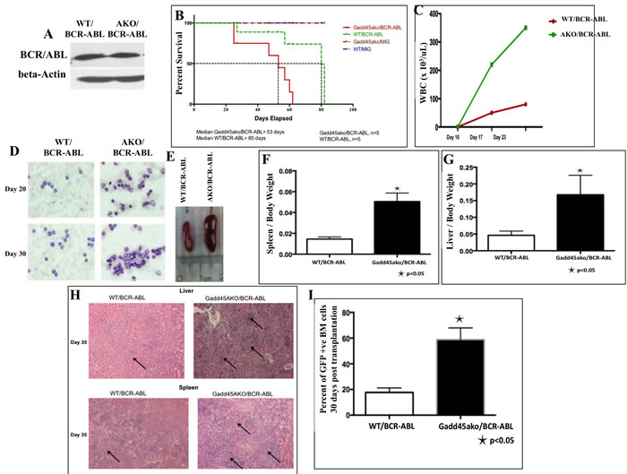 Figure 1: Loss of Gadd45a accelerates the onset of BCR-ABL driven leukemia in recipient mice. A. There is no significant difference in expression of BCR-ABL in WT and Gadd45a-/- BM (AKO) cells used for BMT. B. Kaplan Meier survival curve of WT recipients transplanted with equivalent number of BCR-ABL transduced BM cells from the two genotypes (n = 5 per genotype, P < 0.05) C. Total number of WBCs in peripheral blood at indicated times after transplantation. (n = 3) D. May Grunwald Giemsa staining of peripheral blood 20 and 30 days after transplantation (original magnification, x600) E. Gross appearance of the spleens and F.-G. Ratio of spleen and liver weights to body weight 35 days post transplantation. Error bars represent SEM p < 0.05 (n = 3) H. H&E staining of liver and spleen sections revealed increased leukemic cell infiltration in mice transplanted with Gadd45a-/-/BCR-ABL-expressing BM (see arrows) I. Increased percentage of GFP+ve BM cells in mice transplanted with BCR/ABL-expressing Gadd45a-/- BM. Results are the average of 3 independent experiments.