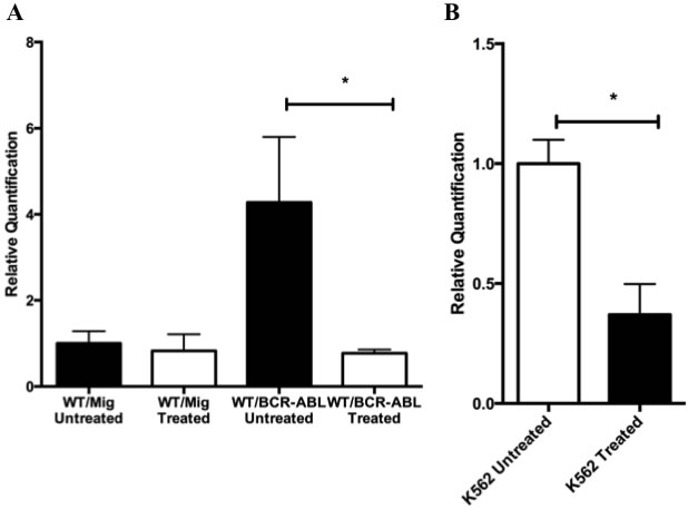 Figure 2: BCR-ABL upregulates Gadd45a expression.A. Real time PCR analysis using taqman probe, of Gadd45a mRNA transcripts in WT BM cells transduced with either MIG or BCR-ABL expressing retroviral vector that has been treated or untreated with 5uM Imatinib. Expression is relative to WT/MIG treated sample. B. Real time PCR analysis using taqman probe, of Gaddd45a mRNA transcripts in K562 cells treated and untreated with Imatinib. Expression was determined by using 18s rRNA as an endogenous control in AB Step one plus real time PCR machine. Data from 3 experiments is shown. Error bars represent SD for each group (* P < 0.05).
