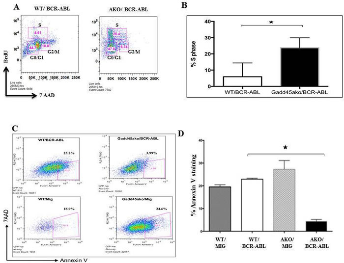 Figure 3: Loss of Gadd45a enhances proliferation and reduces apoptosis of myeloid progenitors expressing BCR-ABL oncoprotein. A. Analysis of BrDU incorporation in BM cells from mice following BMT with Gadd45a-/-/BCR-ABL and WT/BCR/ABL BM, 35 days post transplantation. Cells undergoing proliferation showed an increase in % S-phase population. B. Quantification of percentage of S phase cells in WT/BCR-ABL and Gadd45a-/-/BCR-ABL BM from A.. Error bars represent SEM, P < 0.05 (n = 4 per genotype). C. Flow cytometric data of apoptotic events (annexin V incorporation) in WT/MIG, WT/BCR-ABL, Gadd45a-/- /MIG and Gadd45a-/-/BCR-ABL BM cells 4 days post retroviral infection. Early apoptotic cells are visualized in lower right quadrant. Data is representative of 3 independent experiments. D. Quantification of percentage of Annexin V positive cells from C.. Summary of FACS data showing average of 3 independent experiments ± SEM P < 0.05.