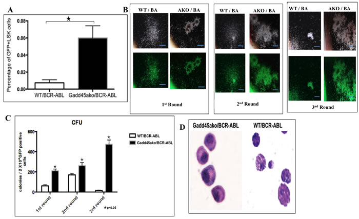 Figure 4: Loss of Gadd45a leads to an increase in the number of BCR-ABL expressing leukemic stem cells (LSCs) as well as an increase in BM self-renewal. A. FACS analysis of GFP+Lin-Sca+cKit+ (LSK) cells in BM of Gadd45a-/-/BCR-ABL and WT/BCR-ABL mice respectively, 21 days post transplantation. Quantification of GFP+ cells that are LSK. Summary of FACS data showing average of 3 independent experiments Bars ± SEM, P < 0.05 B. Representative photomicrograph of colonies from WT/BCR-ABL and Gadd45a-/-/BCR-ABL BM cells from 3 rounds of serial replating. 10 X magnification. C. Average CFU per round of serial replating experiments. Bars ± SEM, P < 0.05 D. Photomicrograph of cytospins of Gadd45a-/-/BCR-ABL and WT/BCR-ABL cells from colonies (40X magnification). Data shown represents 3 independent experiments.