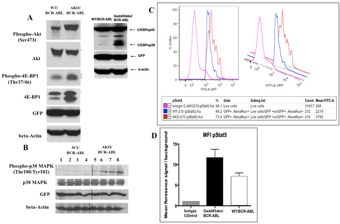 Gadd45a-/-/BCR-ABL cells exhibit hyperactivation of the PI3k/AKT, Stat5 and p38 pathway as well as increased expression of the dominant negative transforming isoform p30 C/EBPa, compared to WT/BCR-ABL cells