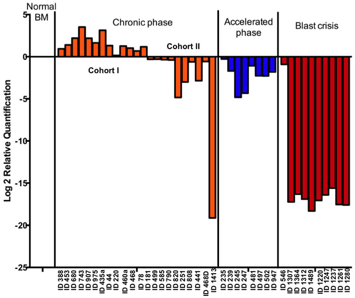 Real time PCR results from 23 chronic phase (CP), 8 accelerated phase (AP) and 10 blast crisis phase (BC) patient samples were compiled according to disease phase at the time sample was obtained. Interestingly, it was observed that Gadd45a expression is up regulated in a cohort of CP samples (cohort I) and is down regulated in all the AP and BC patient samples and in a cohort of CP samples (cohort II) (Figure 7). Notably, retrospective historical analysis of these patients revealed that all blast crisis patients that exhibited low levels of Gadd45a expression exhibited poor response to all forms of therapy resulting in the demise of most of these patients (data not shown). Further follow-up, using long-term longitudinal studies of CP (cohort II) and AP patients that exhibited low levels of Gadd45a expression, will establish if Gadd45a expression is an early indicator of disease progression.