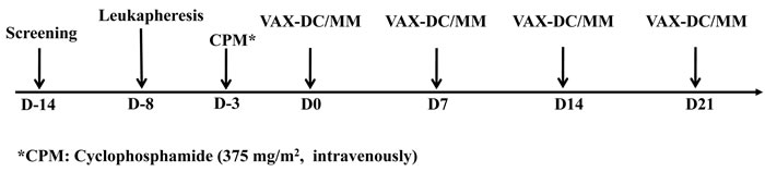 International Myeloma Working Group response criteria were used to assess the treatment response [35]. Disease status was initially assessed at D-14, and then every 4 weeks from first injection of VAX-DC/MM until the time of progression. Toxicity was assessed and graded according to the National Cancer Institute Common Toxicity Criteria (NCI-CTC v4.0) from the first injection of VAX-DC/MM to the end of the study.