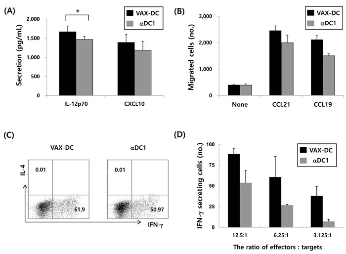 Figure 3: Functional characteristics of VAX-DC/MM. A. VAX-DC/MM produced higher levels of IL-12p70 (*, p<0.05) and CXCL-10 after stimulation with CD40L-transfected J558 cells, compared to αDC1s. B. Efficient migration of VAX-DC/MM in response to chemokine CCL21 and CCL19 comparable to αDC1 evaluated by in vitro transwell system. C. Naïve CD4 T cell polarization by VAX-DC/MM and αDC1 was examined by intracellular staining of IFN-α for Th1 and IL-4 for Th2 after co-culture of allogeneic naïve CD4+ T cells for 12 days in the presence of rhIL-2 (10 U/mL). D. Myeloma-specific cytotoxic T lymphocytes were evaluated by IFN-γ ELISTOT assay. Data are shown from a representative of three independent experiments.