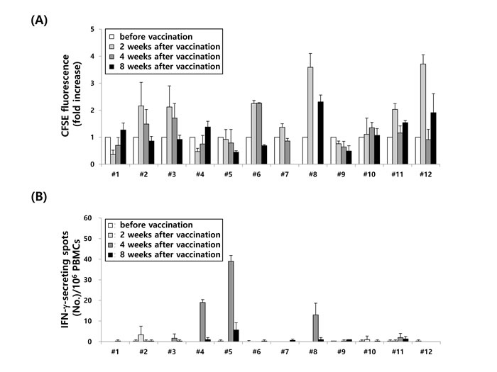 An ELISPOT assay of IFN-γ and T-cell proliferation was performed using PBMCs collected from patients prior to vaccination and at 2 weeks, 4 weeks, and 8 weeks after the first VAX-DC/MM injection. The mature DCs and PBMCs were cryopreserved until use.